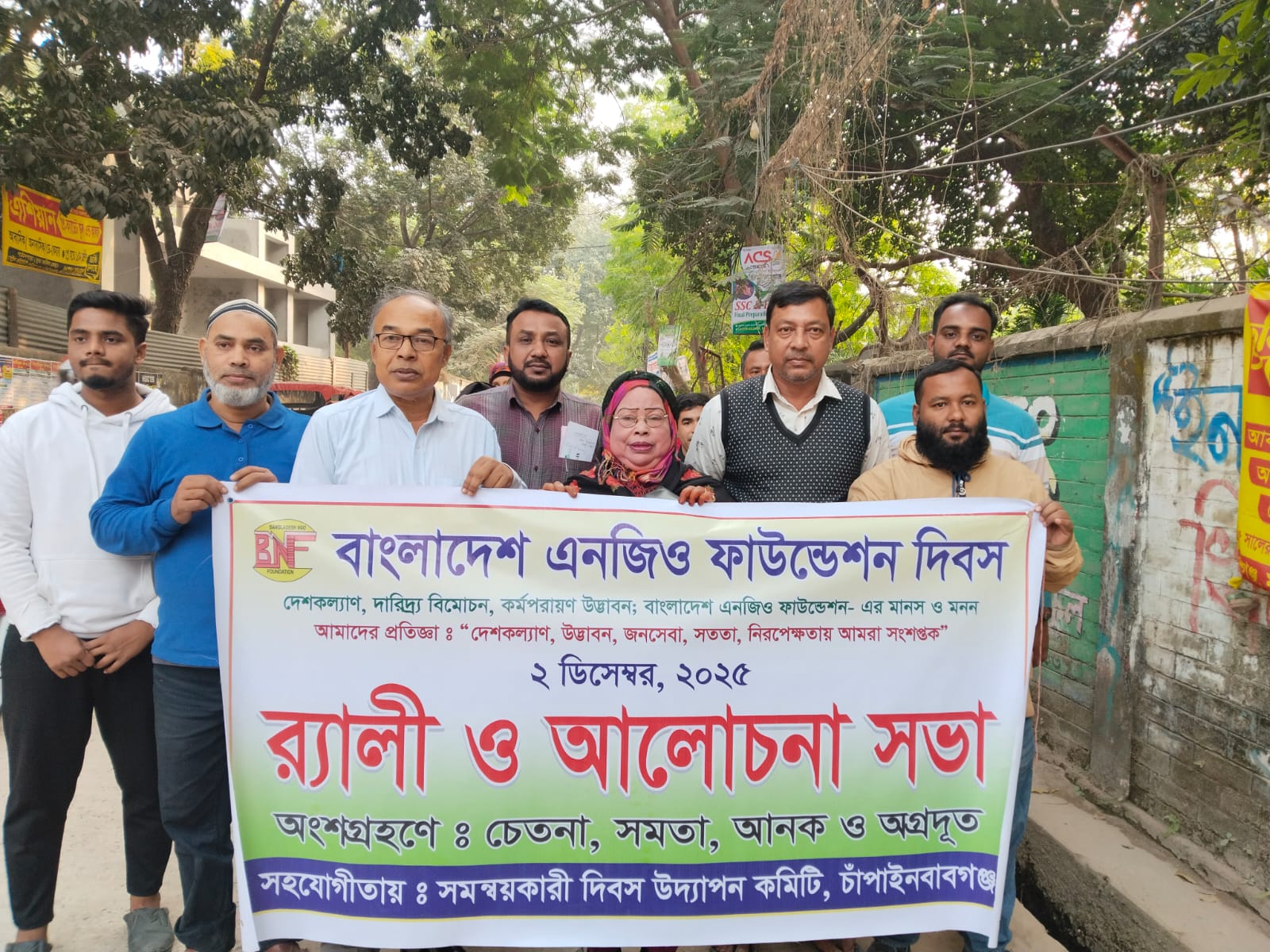 চাঁপাইনবাবগঞ্জ জেলায় পালিত হলো 'বাংলাদেশ এনজিও ফাউন্ডেশন ' দিবস। দিবসটি পালন উপলক্ষে ২ ডিসেম্বর বর্ণাঢ্য র্যালি ও আলোচনা সভার আয়োজন করা হয়। দিবস উদযাপনের আলোচক সংগঠক চেতনা মানবিক উন্নয়ন সংস্থা ছাড়াও তিনটি বেসরকারি প্রতিষ্ঠান যথাক্রমে সমতা নারী উন্নয়ন সংস্থা, আহমদ নগর কমপ্লেক্স (আনক) ও অগ্রদূত বাংলাদেশ অংশগ্রহণ করে। চাঁপাইনবাবগঞ্জ জেলা সদরে কাঁঠাল বাগিচা গাবতলা মোড় হতে বর্ণাঢ্য র্যালি আরম্ভ হয়ে বিভিন্ন সড়ক প্রদক্ষিন করে। র্যালি শেষে চেতনা মানবিক উন্নয়ন সংস্থার ফাল্গুন এক আলোচনা সভা অনুষ্ঠিত হয়। আলোচনা সভায় অতিথি হিসাবে ছিলেন, নবাবগঞ্জ সরকারি মহিলা কলেজের অধ্যক্ষ প্রফেসর ড.বিপ্লব কুমার মজুমদার, আদিনা ফজলুল হক সরকারি কলেজের অধ্যক্ষ প্রফেসর ড. সৈয়দ মোঃ মোজাহারুল ইসলাম তরু, মহিলা বিষয়ক অধিদপ্তরের উপ-পরিচালক সাহিদা আখতার। উক্ত অনুষ্ঠানে সভাপতিত্ব করেন, চেতনা মানবিক উন্নয়ন সংস্থার প্রধান নির্বাহী কর্মকর্তা মোঃ মামুন উল আলম। অনুষ্ঠানে স্বাগত বক্তব্য রাখেন চেতনা মানবিক উন্নয়ন সংস্থার নির্বাহী পরিচালক মোঃ জাফরুল উল আলম। এছাড়াও আরো উপস্থিত ছিলেন আর এস ডি এফ এর নির্বাহী পরিচালক মনজুরুল ইসলাম বাবু, সমতা নারী উন্নয়ন সংস্থার সভানেত্রী মোসাঃ আকসানা খাতুন। আলোচকগণ বলেন দক্ষতা, সেবা ও সহায়তা কাঠামো সাথে যোগাযোগ সৃষ্টির মাধ্যমে অনগ্রসর জনগোষ্ঠীকে উন্নয়নের ধারায় সম্পৃক্তকরণের ভিশন নিয়ে বাংলাদেশ এনজিও ফাউন্ডেশন ২০০৪ সালে প্রতিষ্ঠার পর দুই দশক ধরে কাজ করে চলেছে। সহযোগী সংস্হাসমূহকে বিশেষ ও সাধারন অনুদান প্রদান করে উদ্ভাবনীমূলক কার্যক্রম গ্রহণের মাধ্যমে তাদের দক্ষতাকে কাজে লাগিয়ে দেশের আর্থ সামাজিক উন্নয়ন ও দারিদ্র বিমোচনে বাংলাদেশ এনজিও ফাউন্ডেশন লক্ষণীয় অবদান রাখছে। দরিদ্র জনগোষ্ঠীর টেকসই উন্নয়নের লক্ষ্যে বাংলাদেশ এনজিও ফাউন্ডেশনের অনুদানের উপকার ভোগীদের মাঝে আয়বর্ধমূলক কর্মসূচি বাস্তবায়নের জন্য গাভী পালন, গরু মোটাতাজাকরণ, ছাগল ও ভেড়া বিতরণ, ভ্যান বিতরণ, সেলাই মেশিন বিতরণ, পাপস তৈরি প্রশিক্ষণ প্রভৃতি প্রদান করা হয়। এর মাধ্যমে বিভিন্ন দরিদ্র পরিবারগুলো পারিবারিক সামাজিক ও অর্থনৈতিক উন্নয়নে ইতিবাচক প্রভাব পড়েছে। এ ছাড়া গ্রামের জীবনযাত্রার মান উন্নয়নের লক্ষ্যে দরিদ্র পরিবার সমূহে স্বাস্থ্যসম্মত সেমি পাকা ল্যাট্রিন স্থাপন,নিরাপদ পানি সরবরাহে নলকূপ স্থাপন, গৃহনির্মাণ প্রভৃতি কর্মসূচি বাস্তবায়ন করছে।